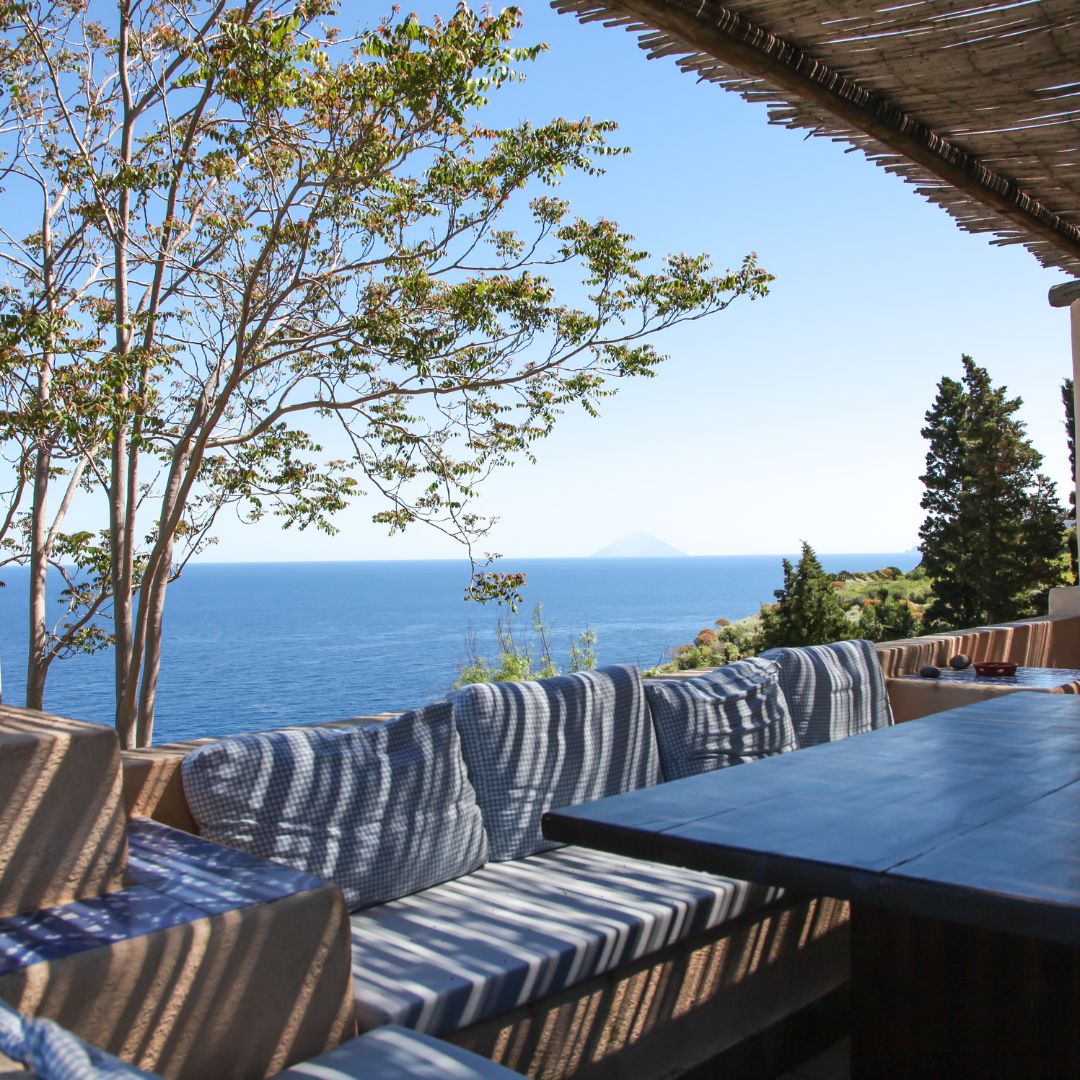 Questa splendida villa, immersa nei vigneti e risalente agli anni '30, è arredata con raffinata eleganza nel tipico stile eoliano e si sviluppa su due livelli.