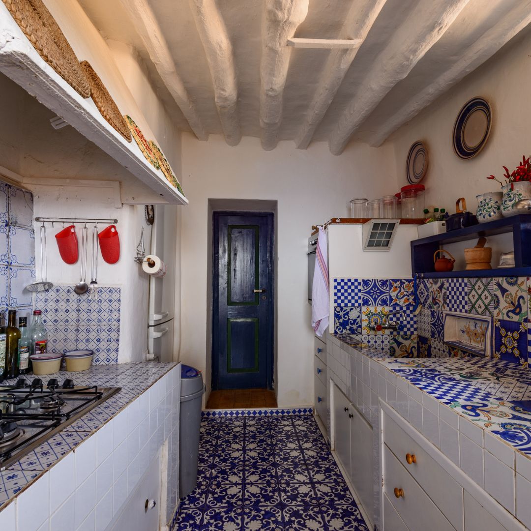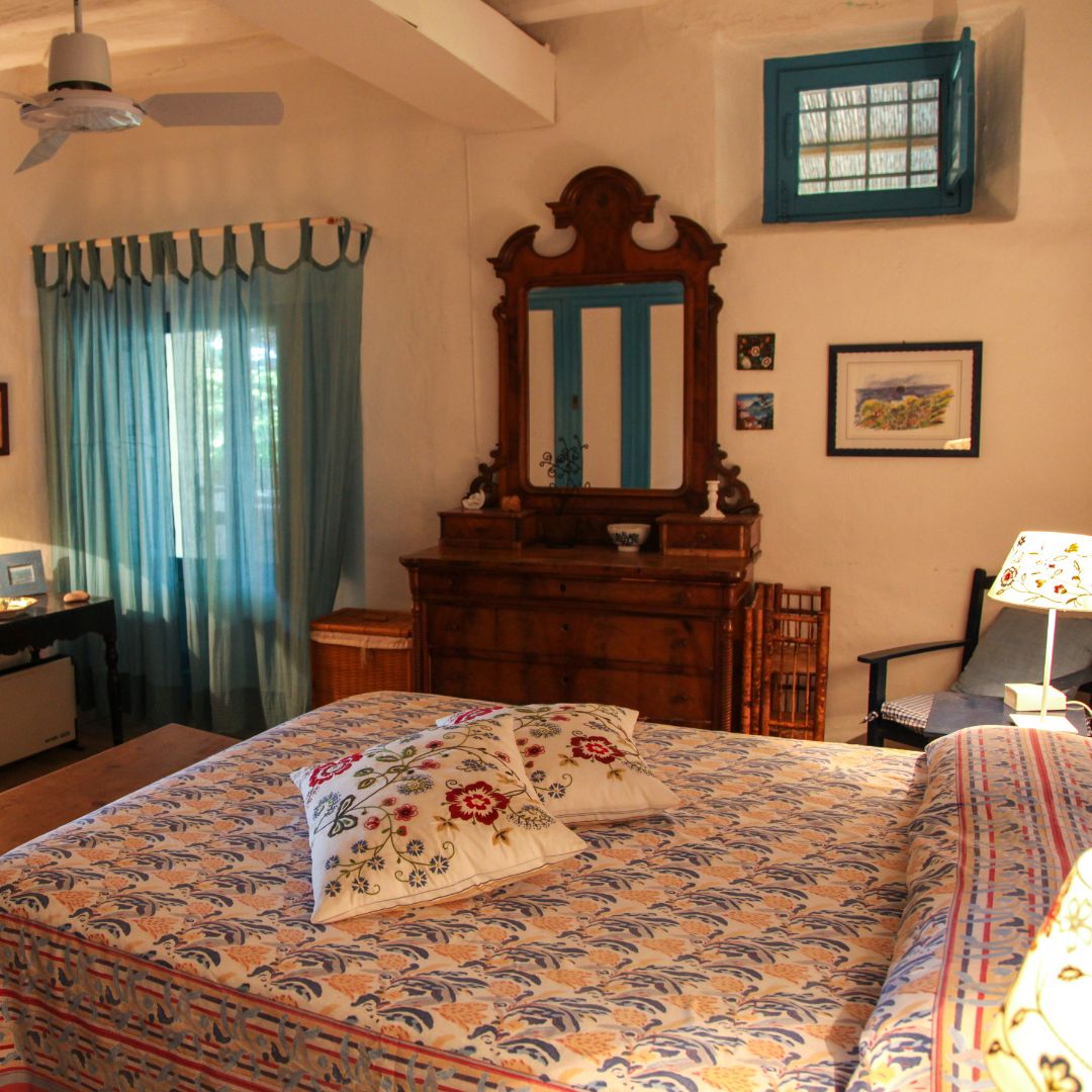 Sulla sinistra, una porta conduce a una romantica camera matrimoniale con un piccolo balcone affacciato sul mare, mentre dalla zona pranzo si accede alla camera padronale, dotata di bagno privato con doccia. Entrambe le camere si aprono su un’ampia e tranquilla terrazza d’ingresso, immersa nella vegetazione mediterranea. Sullo stesso livello si trovano anche un secondo bagno con doccia e una cucina completamente attrezzata, impreziosita da antiche maioliche colorate.